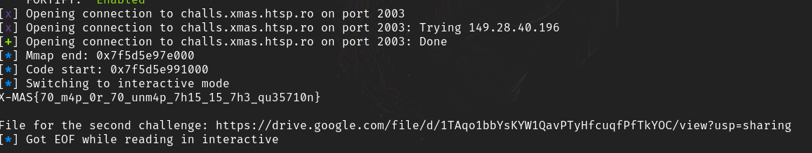 After that, we used the MAP_FIXED flag and allocated a memory chunk right over the .text segment with an rwx page and then used the read function to overwrite it with some shellcode which opens the flag, reads its contents into a buffer and finally prints the flag using write().